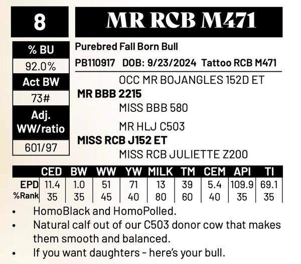 Recently purchased for our Purebred Braunvieh Herd. Mr. RCB M471 is 92% Braunvieh and Homozygous Black and Homozygous Polled.